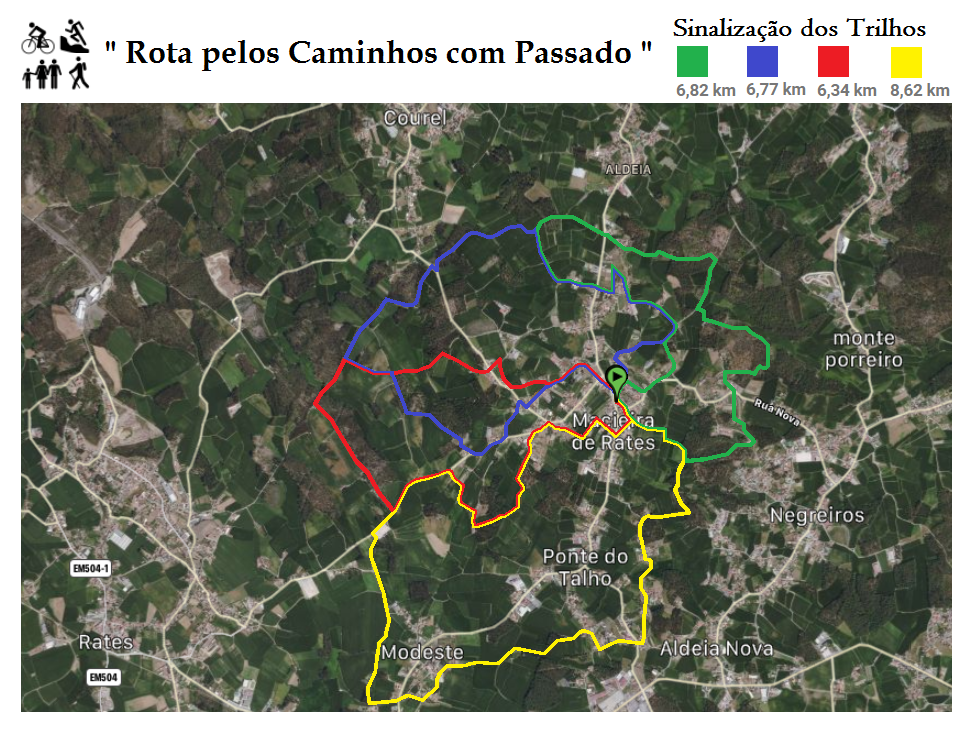 Este projecto " Rota pelos Caminhos com Passado..." tem como princípios fundamentais, desenvolver-se ao longo de matas e trilhos florestais, prados e zonas habitacionais, constituindo um mosaico do ponto de vista ambiental, paisagístico, cultural e histórico da freguesia de Macieira de Rates. Esta Rota foi projectada pontuando por um património geológico com terrenos pedregosos muitos sob a forma de xisto, outros entremeados de algumas linhas de água, nas matas e florestas predominam o pinheiro-bravo, podendo observar-se também carvalhos, sobreiros, castanheiros, salgueiros, entre outas espécies que abrigam a herpetofauna diversa pretendendo deste modo no futuro criar de galerias ripícolas. Nas zonas habitacionais, pode-se encontrar espaços correspondentes a actividades agrícolas ainda existentes e dispersos pela freguesia, tais como azenhas, espigueiros, património religioso capelas, alminhas, fontanários entre outros nichos alusivos á época.